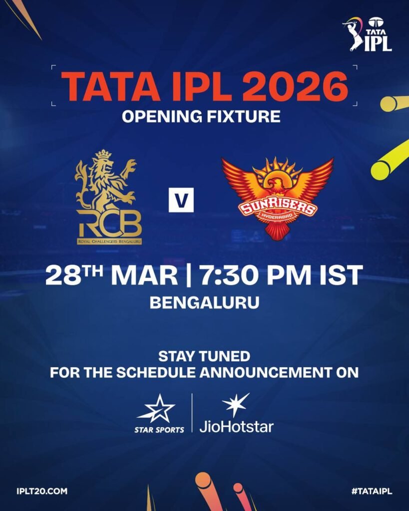 नई दिल्ली: Indian Premier League 2026 के पहले चरण का शेड्यूल जारी कर दिया गया है। टूर्नामेंट की शुरुआत 28 मार्च को होगी, जहां मौजूदा चैंपियन Royal Challengers Bengaluru का मुकाबला Sunrisers Hyderabad से बेंगलुरु के M. Chinnaswamy Stadium में होगा।