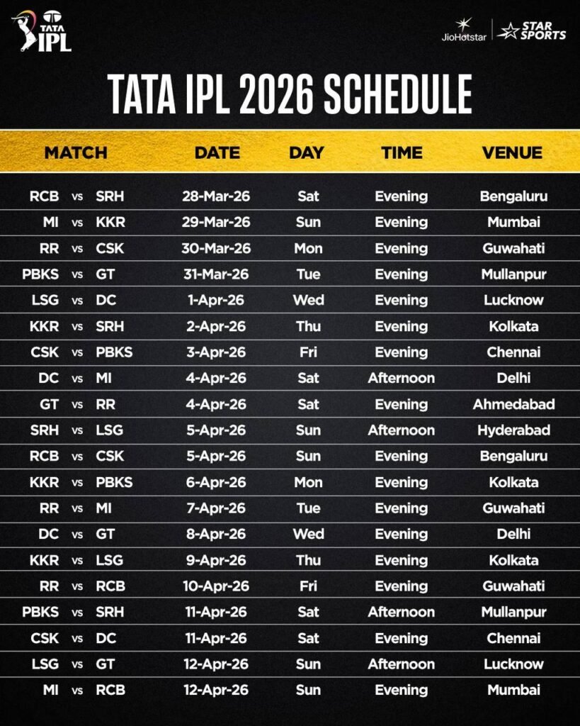 आईपीएल 2026 (पहला चरण) – मैच शेड्यूल